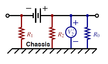 만약 저항값이 낮은 곳을 알아내기 위해서 R0 큰 저항을 양극 쪽 배터리와 새시 사이에 위치시킵니다.