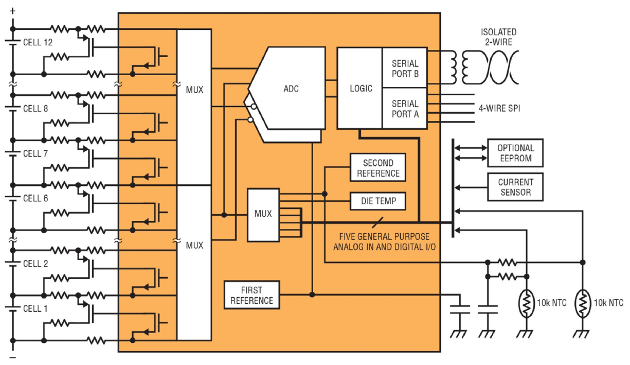 해당 칩셋은 12개의 직렬 셀이 들은 모듈에 대해서 모니터링할 수 있으며 또한 100개의 셀이 들은 팩에도 모니터링이 가능합니다. 그리고 내부 또는 외부에서 셀의 상태를 안정적 이도록 하는 전자회로 추가에 대한 지원을 하며 모듈 자체에서 파워를 얻을 수도 있고 또는 외부에서 파워를 얻어 작동됩니다.