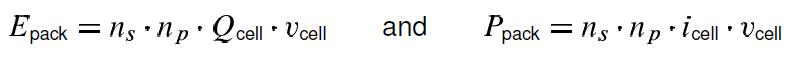 최종적으로 total 한 팩의 에너지와 파워를 구하기 위해서는 다음과 같이 표현됩니다. 에너지는 커패시터와 전압의 곱이며 파워는 전류와 전압의 곱으로 표현되기 때문에 각각의 배치에 dependent 한 개수를 곱하면 됩니다.