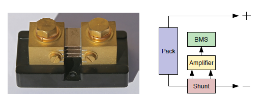 션트 센서는 매우 작은 고 밀도의 저항(0.1m(ohm))입니다. 배터리 팩에서 직렬로 붙어있으며 보편적으로 낮은 전압에서 사용됩니다. 마찬가지로 V=IR을 통해서 계산이 되며 다만 션트는 저항이기 때문에 작더라도 전압 강하를 일으킵니다. 때문에 큰 파워 손실이 일어나지 않도록 하기 위해서 저항을 작게 만듭니다.