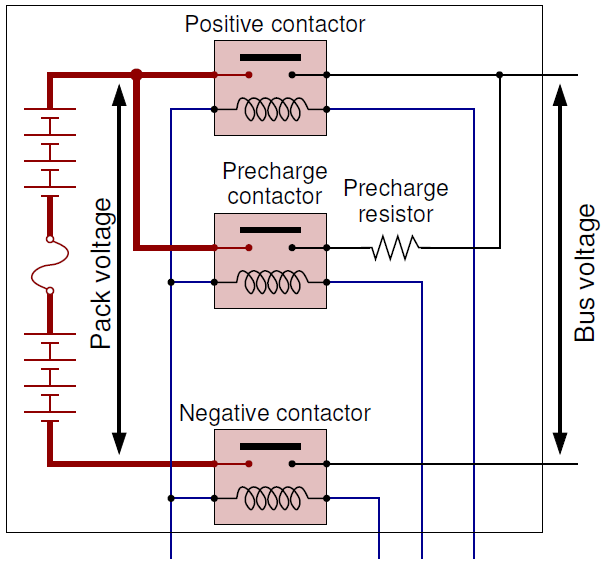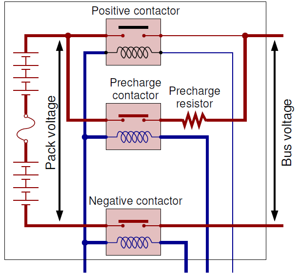 하단의 사진은 접촉기가 연결되어 있는 다이어 그램입니다. 총 3가지의 접촉기가 연결되어 있고 positive, precharge, negative 접촉기가 붙어있습니다. 그리고 각각의 접촉기에는 코일이 붙어있는데 해당 코일에 의해서 코일이 활성화되면 접촉기가 닫히고 고전류 단자 사이에 연결되며 코일이 비활성화되면 접촉기가 열리고 고전류 단자가 분리됩니다. 그리고 현재 굵은 선은 현재 활성화된 회로의 부분을 보여주고 있습니다.