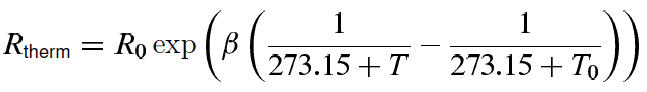 T는 측정된 온도이며 R_0는 기준온도 T_0일 때의 저항이며 273.15는 캘빈 온도로 바꾸기 위해서 사용되었습니다. 그리고 베타 계수는 장비의 파라미터에 영향을 받습니다.