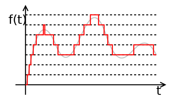 예를 들어서 ADC의 입력 범위가 0~5V의 범위를 가지고 있으며 16bit의 정확도를 가지고 있다고 했을 때 resolution, Q는 (5V-0V) / 2^16 = 76 x10^(-6) V 즉 76 마이크로 볼트까지 신호를 쪼개어서 표현이 가능합니다. 해당 전압은 제시된 ADC의 최소 표현의 전압으로써 종종 least-significant bit voltage라고 불려지기도 합니다. 여기서 더 작아진다면 어떠한 신호가 들어오면 위에 사진처럼 네모처럼 쪼개어지는 게 아니라 실제의 신호와 근사한 유형의 polynomial 그래프로 표현이 가능할 수가 있습니다.