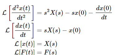 2) 시간 영역 (t)에서 표현된 시스템의 상미분 방정식을 주파수 영역 (s)로 라플라스 변환을 통해서 바꿔줍니다. 그러기 위해서는 1, 2차 미분 방정식의 라플라스 변환과 관련된 아래의 식을 이용해줍니다.