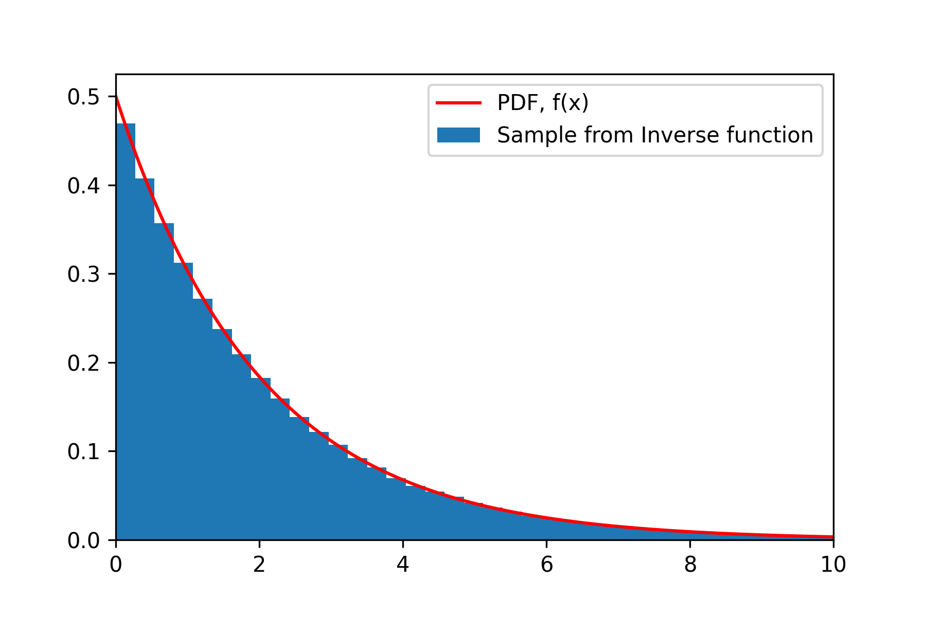 결과는 다음과 같습니다. 파란색은 히스토그램이며 Inverse CDF를 통해서 얻은 결과입니다. 그리고 빨간색은 Reference 선인 PDF입니다. 결과적으로 잘 추정하는 것을 볼 수가 있었습니다.